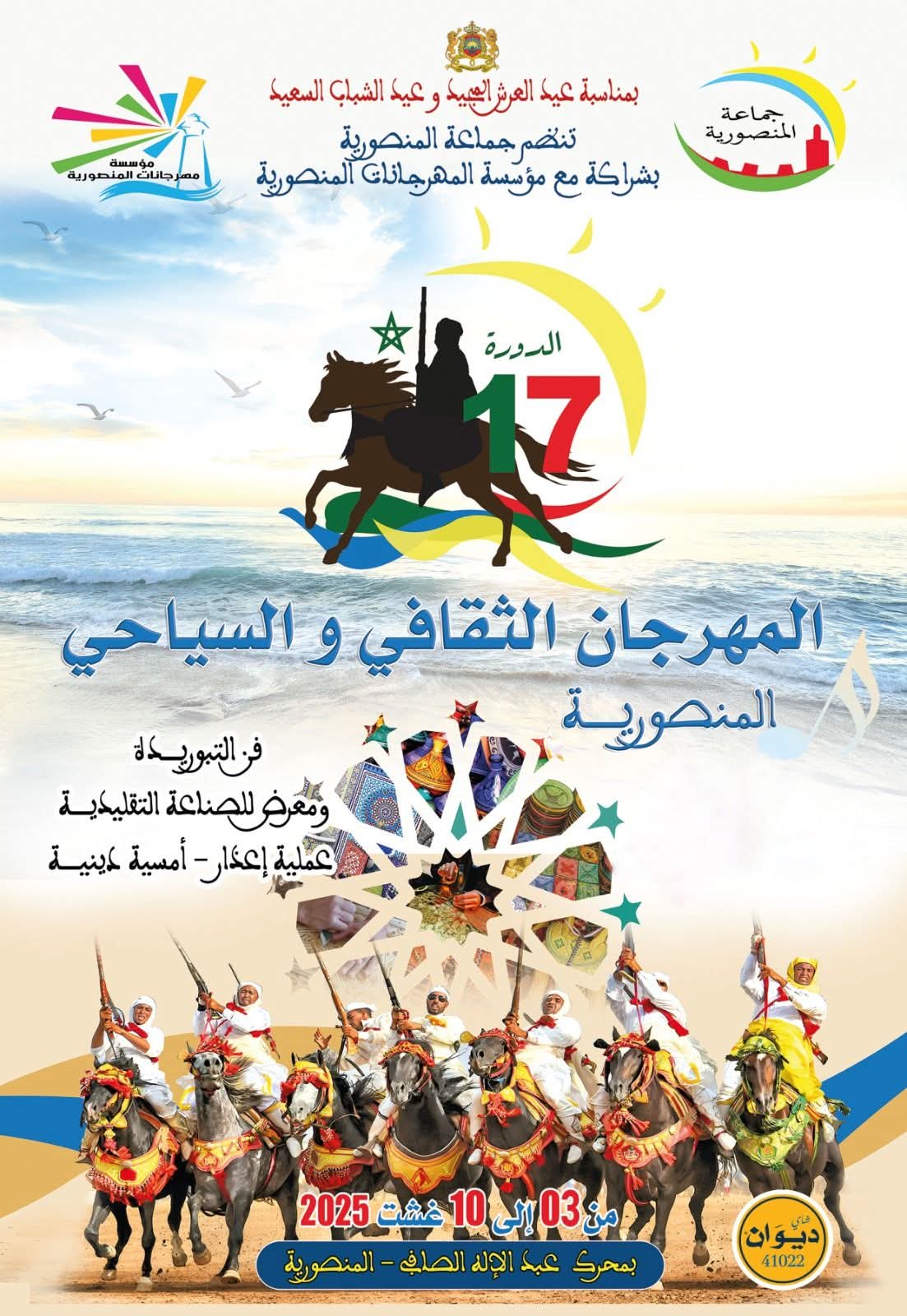 في إطار الترويج للمؤهلات الثقافية والسياحية لجماعة المنصورية وتعزيز الدينامية التنموية بالمنطقة، تعلن الجماعة الترابية للمنصورية عن تنظيم الدورة السابعة عشرة من المهرجان الثقافي والسياحي، وذلك خلال الفترة الممتدة من 01 إلى 10 غشت 2025، تحت إشراف السلطات المحلية وبشراكة مع مختلف الفاعلين والمؤسسات المعنية.